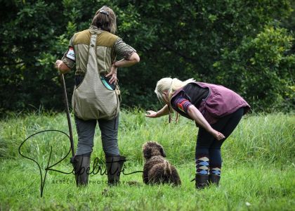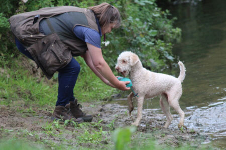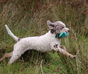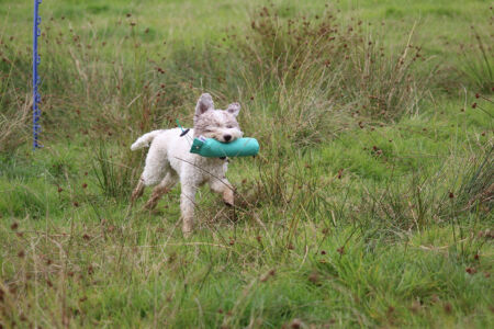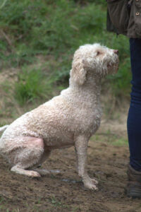 Louise Ferguson with Sage, alongside Susan Tindall & Kara and Jude Bullen & Florence, entered an AV Novice Spaniel Working Test (for main, rather than minority, breed spaniels). Louise and Sage led the Lagotto results, receiving a Certificate of Merit (COM) from the Judges, Terri Siwek and Julie Etherington – an excellent result amongst competition from English Springer Spaniels and Working Cockers!
